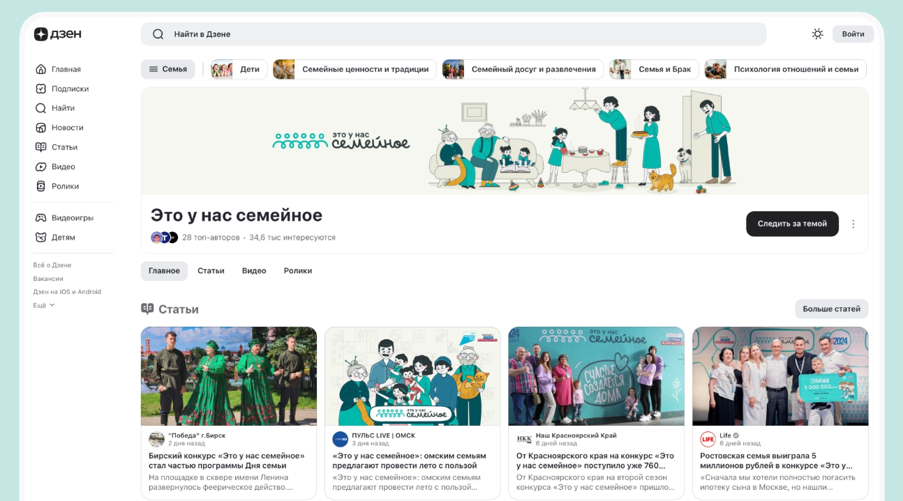 Первым шагом в рамках сотрудничества президентской платформы «Россия – страна возможностей» и новостной платформы «Дзен» стал запуск тематического канала конкурса «Это у нас семейное». Здесь на основе умных алгоритмов собирается актуальный контент от авторов в разных форматах – это новости, истории участников конкурса, материалы о семейных традициях, а также статьи экспертов о наставничестве и преемственности. Чтобы следить за обновлениями, достаточно нажать «Следить за темой», специальный канал станет доступен во вкладке «Подписки».