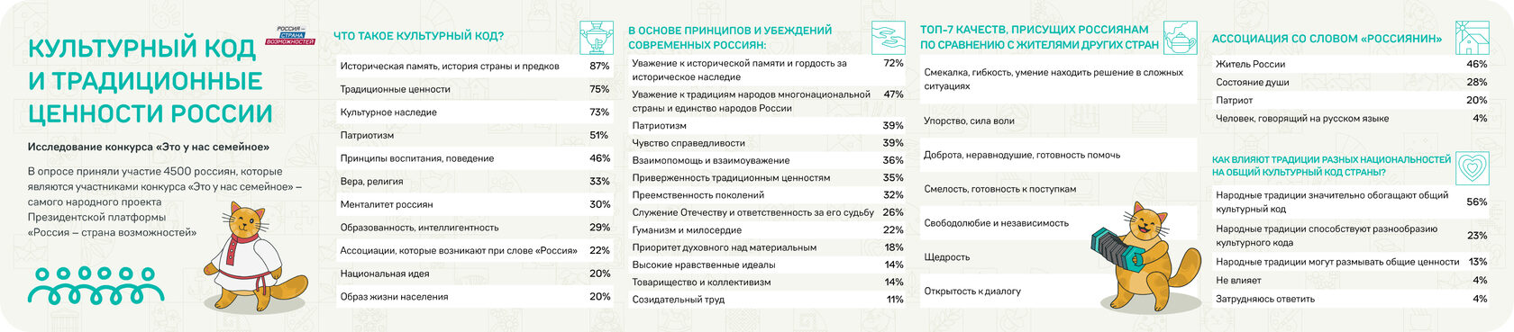 Россияне воспринимают культурный код через историческую память, традиции и духовные ценности, следует из опроса, проведенного конкурсом «Это у нас семейное». В опросе участвовали 4,5 тысячи россиян из всех регионов страны.